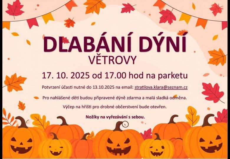 Dne 17.10.2025 od 17:00 hod na parketu Větrovy se chystá dlabání dýní.